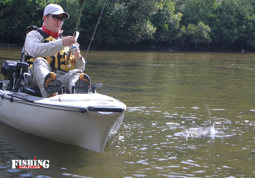 The tide was running strongly now. We were able to drift downstream, carried by the tide at a steady pace, casting as we went. Greg, sitting in a luxurious armchair on his Hobie, looked like a king on the throne as he waved his wand from side to side, casting and hooking a few nice bream up against the weed beds.